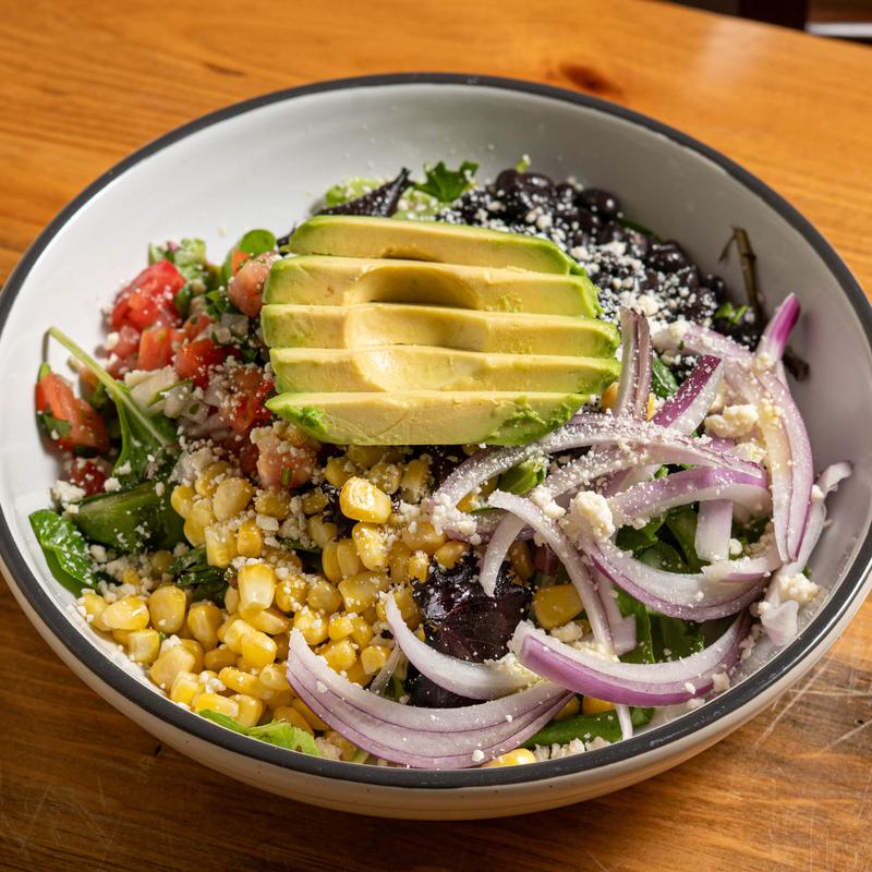 Chopped lettuce, black beans, avocado, pico de gallo, roasted sweet corn, red onion, cotija