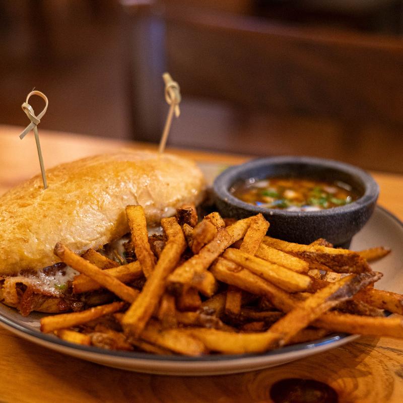 Red chile braised beef, Mijas cheese blend, onion, cilantro, chile-beef consommé, house-made bolillo roll